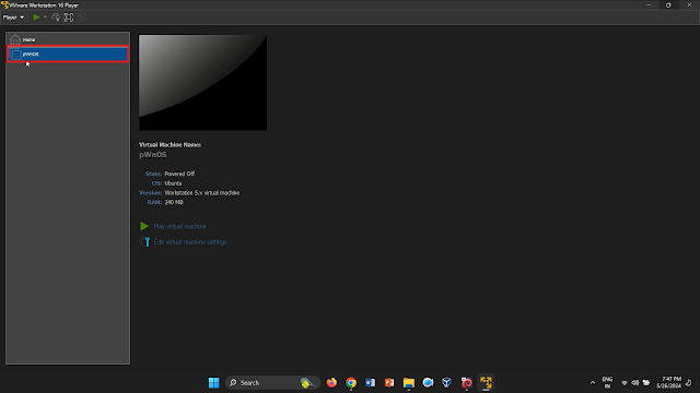 "pWnOS" vulnerable machine is listed in the VMware Manager.